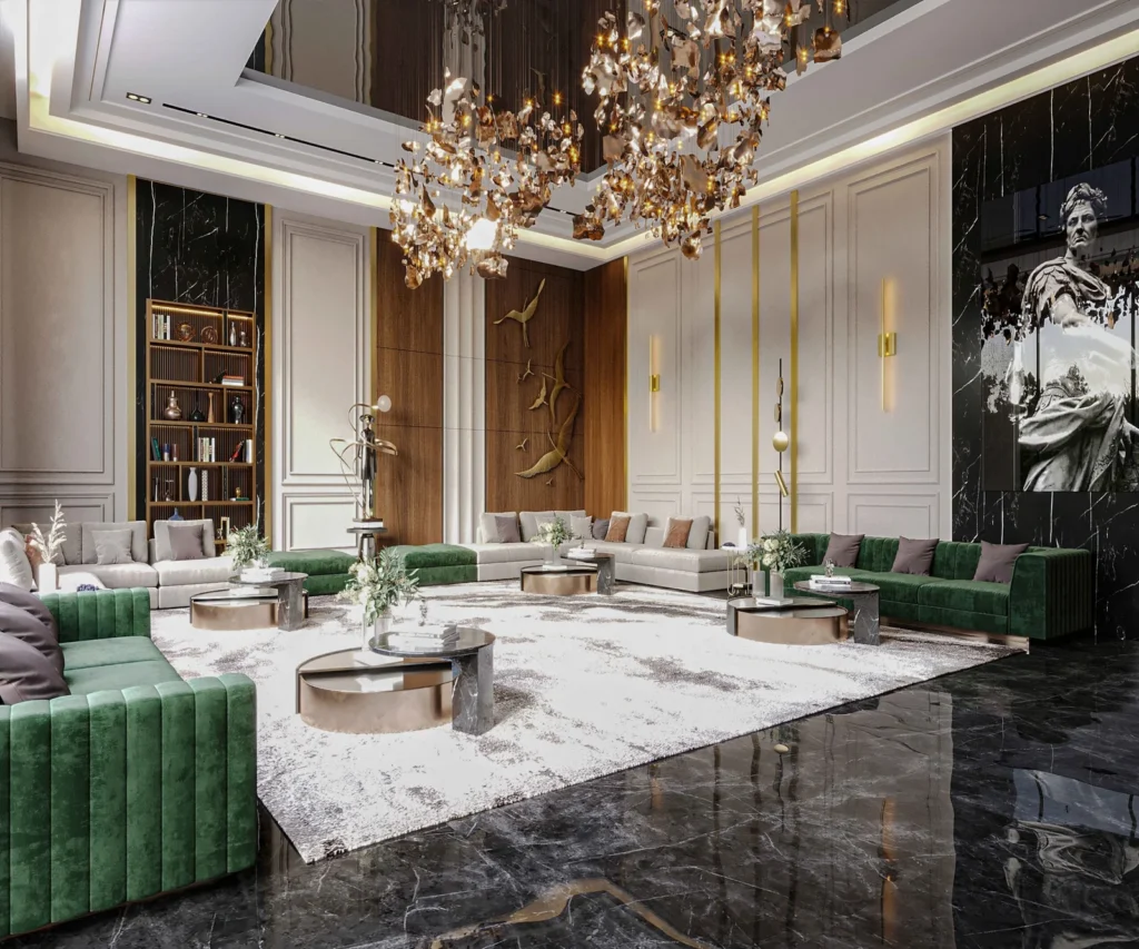 يُعزز اللون الأخضر الشعور بالانتعاش والحيوية، ويُرتبط بالطبيعة والاسترخاء. يمكن استخدامه بشكل جيد في المساحات التي تهدف إلى توفير جو منعش ومريح