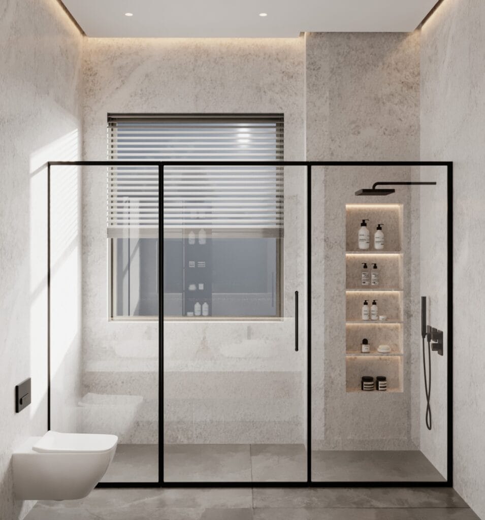 - يمكن استخدام اللون الأزرق الفاتح أو الأخضر لإضفاء لمسة من الهدوء والانتعاش، مما يعزز الشعور بالاسترخاء أثناء الاستحمام.