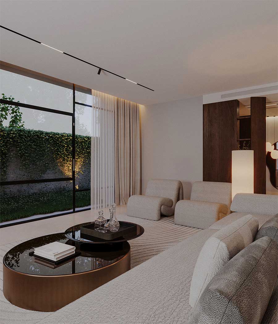 من أبرز تفاصيل المشروع كانت غرفة المعيشة الواسعة المطلة على الحديقة، واللي اتصممت بفرش مميز وألوان متناغمة بتدي إحساس بالترحيب والدفء. كمان ركزنا على توزيع الإضاءة المخفية والثريات البسيطة اللي زودت من فخامة المكان بدون تكلف. أما في منطقة السفرة، فتم المزج بين الخشب الفاتح والأثاث العصري لإضافة لمسة راقية وأنيقة.
