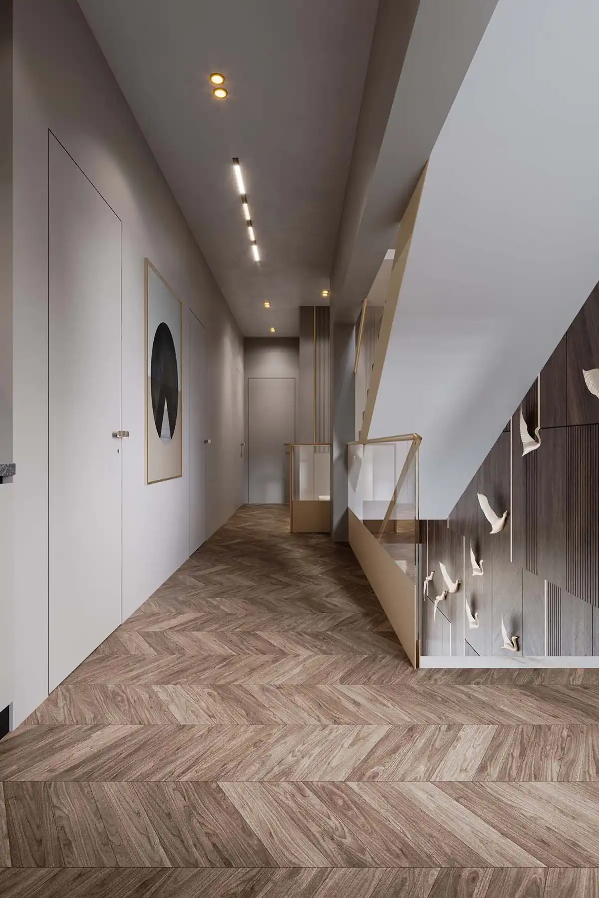 الاهتمام بالإضاءة كان عنصرًا أساسيًا في التصميم، حيث استُغلت الإضاءة الطبيعية القادمة من الواجهات الزجاجية الواسعة لإضفاء الدفء والحيوية على المساحات الداخلية طوال النهار. وفي الوقت ذاته، أضيفت إضاءات مخفية متكاملة داخل الأسقف الجبسية والحائطية، لتعزيز الجانب الجمالي وإبراز تفاصيل الديكور، مع توفير إضاءة عملية وهادئة عند الحاجة.