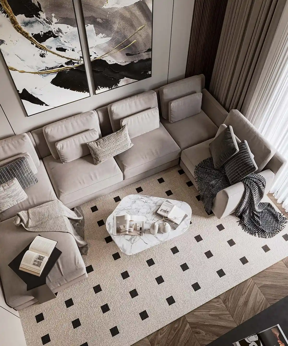 توزيع الأثاث في هذا المشروع لعب دورًا محوريًا في إبراز اتساع المساحات وفتح الفراغات على بعضها البعض، ما خلق تدفقًا بصريًا سلسًا بين الصالون، وغرفة الطعام، والمطبخ المفتوح. تم الاعتماد على خطوط توزيع مدروسة تسمح بسهولة الحركة وتوفر مناطق جلوس مريحة وموجهة للاستمتاع بالإطلالة الطبيعية من النوافذ الكبيرة.