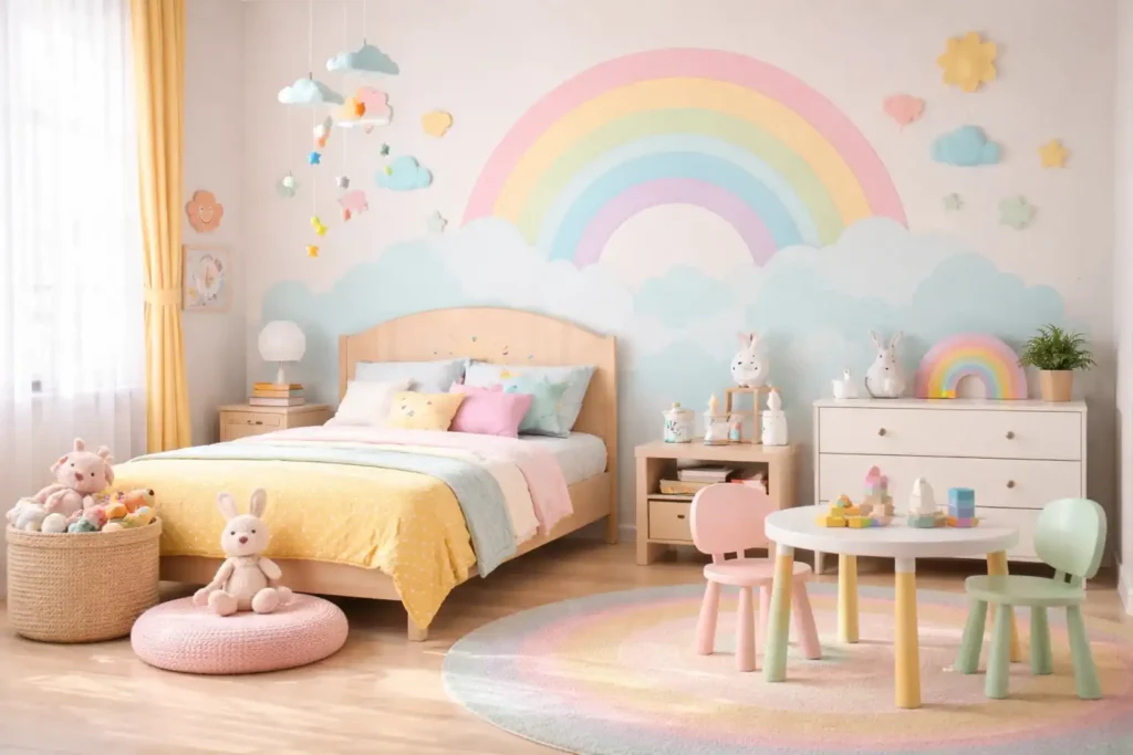 الأطفال يفضلون الألوان المبهجة والمرحة، لذلك يمكن استخدام الأصفر الفاتح، الوردي الباستيل، أو الأزرق السماوي. كما يمكن دمج أكثر من لون بشكل هندسي أو برسومات جدارية تضفي جوًا من الإبداع والمرح.